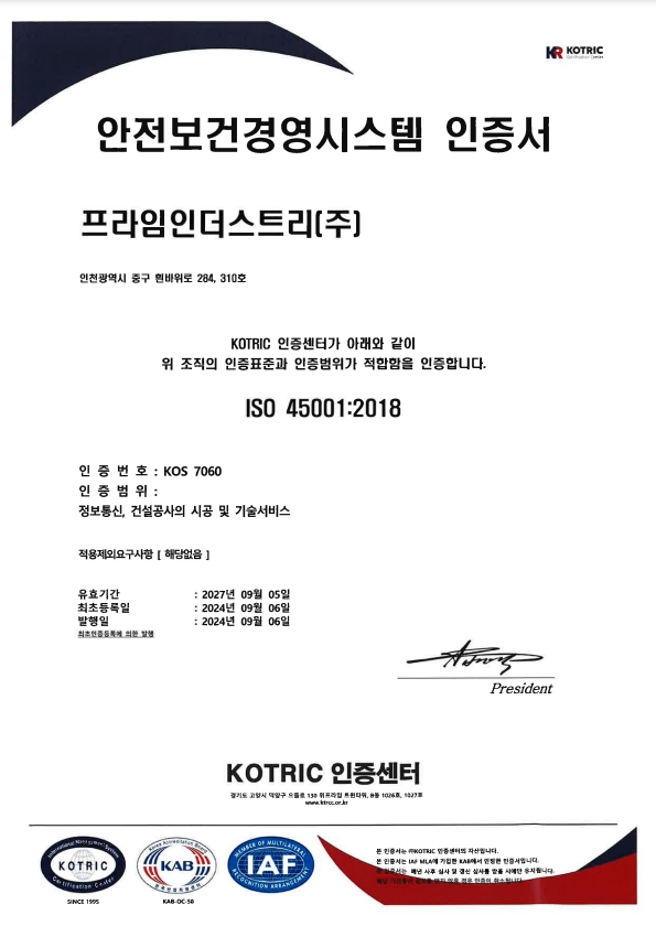 프라임인더스트리 주식회사의 안전보건경영시스템 인증서입니다.